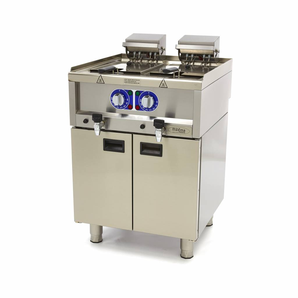 Ez a professzionális és nagy teljesítményű mélysütő két kosárral rendelkezik nagy mennyiségű étel mélysütéséhez. Két különálló 10 literes olajtartállyal rendelkezik, így egyszerre tud különböző ételeket mélysütni. Mindkét olajtartály külön fűtőelemmel és leeresztőcsappal rendelkezik a könnyű tisztítás érdekében.