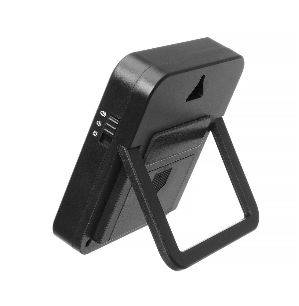 ABS-ből készült ház, kihajtható állvánnyal, lógó lyukkal és egy fémfelületekre akasztható mágnessel.