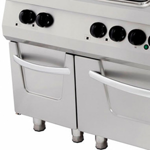 A sütő szintén elektromosan működik, és rengeteg helyet kínál. Akár 300°C-ra is felmelegíthető, és egy krómozott sütőráccsal rendelkezik, amely három szintes, 2/1 GN méretű edények számára. A statikus sütőtér teljes egészében rozsdamentes acélból készült, és a felső és alsó részén fűtőelemekkel rendelkezik. Ezek külön-külön vagy egyszerre is használhatók. A sütőajtó extra vastag, 40 mm-es szigeteléssel és elöl nagyméretű fogantyúval rendelkezik. Ez lehetővé teszi, hogy könnyedén nyitható legyen, még sütőkesztyűben is. Ezen kívül ez a tűzhely egy ajtóval ellátott aljjal is rendelkezik, amely extra tárolóhelyet biztosít. Itt tárolhatja például az edényeket és a konyhai eszközöket.